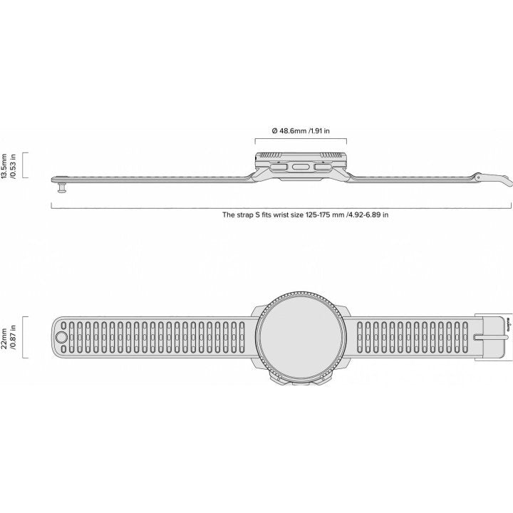 Strap: Silicone - width: 22 mm - for wrist sizes 125-175 mm (additional strap up to 215 mm)